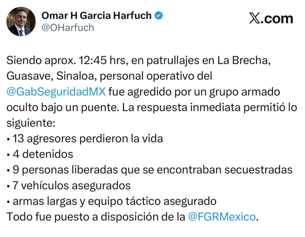 El secretario de Seguridad y Protección Ciudadana (SSPC), Omar García Harfuch, confirmó que 13 presuntos delincuentes fueron abatidos por fuerzas federales tras un enfrentamiento registrado en el municipio de Guasave, Sinaloa.